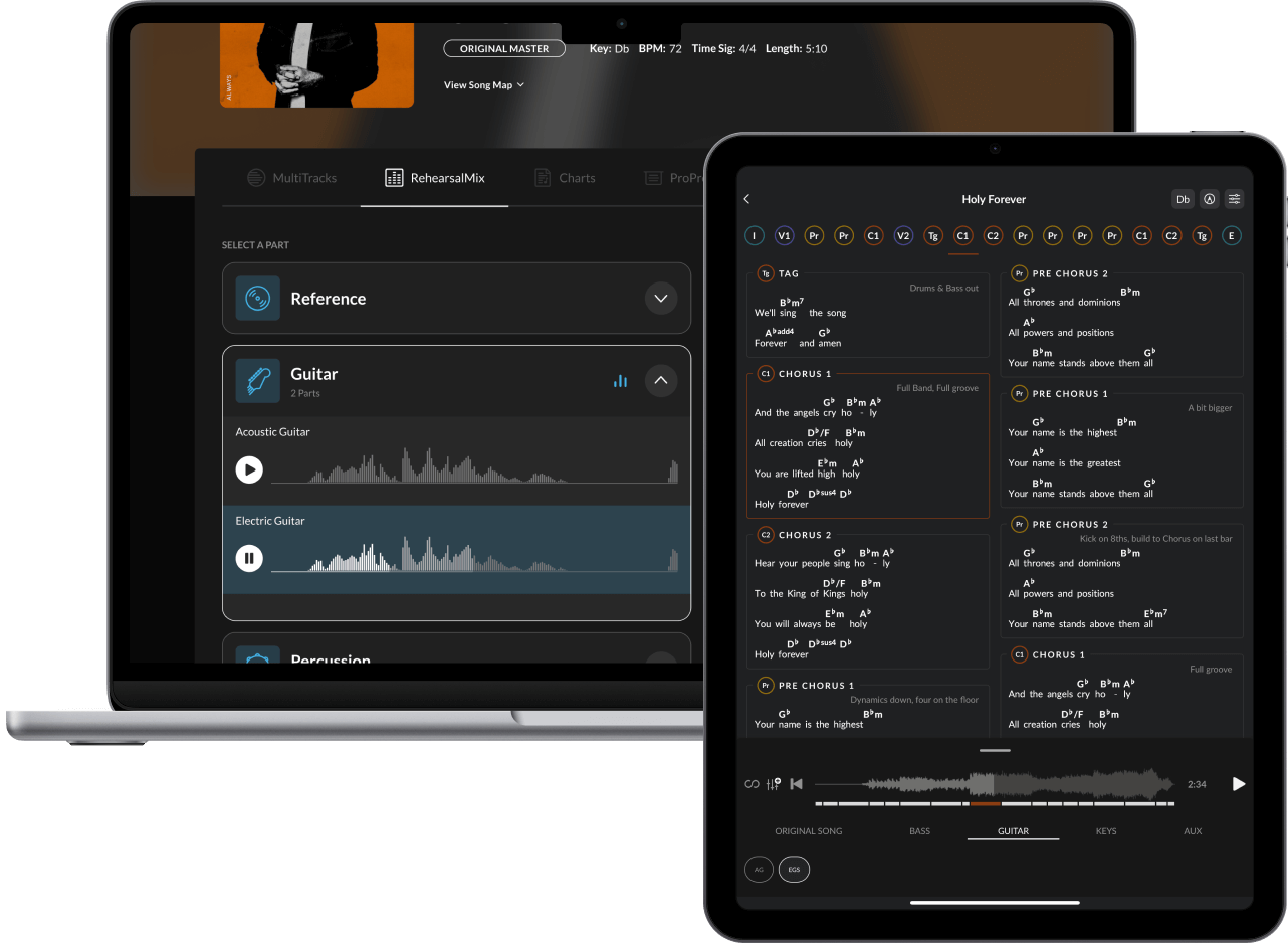 Stream over 9,106,000 mixes created for rehearsal from a growing catalog of over 35,000 songs. Access every part of every song in eight keys and stream the original song - all for one affordable monthly price.